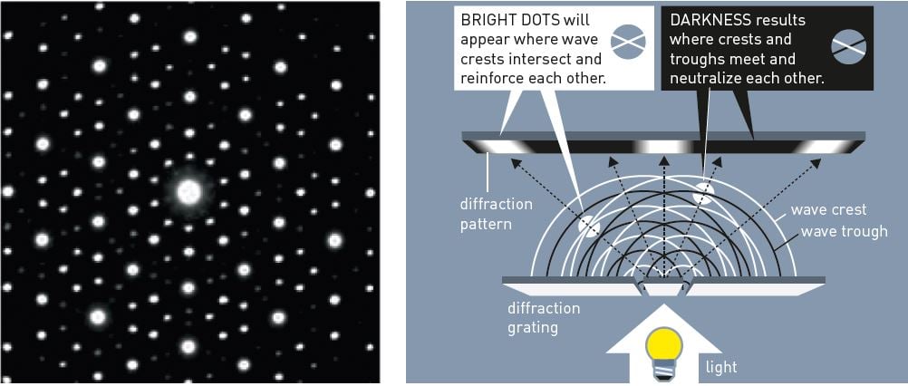 On the other side of the grating, waves spread in a semicircular manner and intersect with other waves. Crests and troughs of the waves reinforce and counteract each other. On a screen behind the diffraction grating, a pattern will appear of light and dark areas – a diffraction pattern.