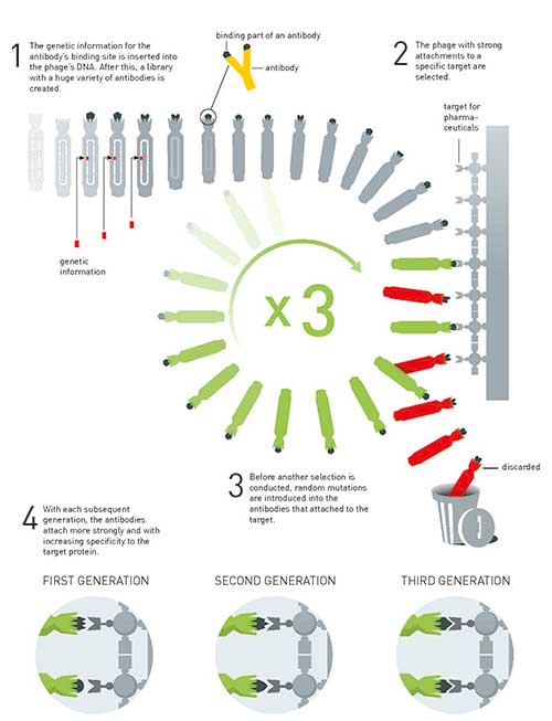 Figure 4. The principle for the directed evolution of antibodies using phage display. This method is used to produce new pharmaceuticals.