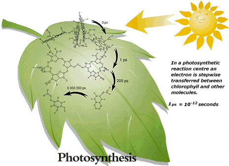 In photosynthesis plants use light to form energy-rich compounds from water and carbon dioxide from the air. The decisive reactions occur in a reaction centre in the cell. The incoming light is caught in an antenna system and finds its way to a pair of chlorophyll molecules (see picture). Within these molecules an electron is lifted to a higher energy level and is then transferred stepwise (follow the arrows) in a well-defined manner. It is important that the first leaps are very fast as otherwise the electron has time to return to the ground state. The Marcus model may explain the speed of these leaps. Finally the electron finds itself in a relatively stable state and still has enough energy to carry out the chemical work necessary for the organism.