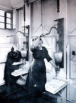 The first batch of dynamite was produced later that year by hand mixing the kieselguhr and nitroglycerine in brass-lined wooden boxes in 45 kilo lots. The cartridging had the benefit of the already developed dynamite cartridging machine. All these process houses had sand floors which had full Government approval on the somewhat dubious grounds that the Ardeer sand was of “such a fine quality that it did not constitute ‘grit’ within the meaning of the Explosives Act of 1875“. Another peculiar “safety” precaution was that the girls who operated both these processes worked in their bare feet.