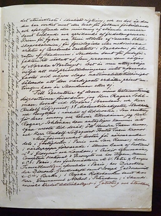 Min förmögenhet består för närvarande dels i fastigheter i Paris och San Remo; dels i värdepapper förvarade i Union Bank of Scotland Ld i Glasgow och London, i Crédit Lyonnais, Comptoir National d’Escompte och hos Alphen, Messin & Co i Paris; hos fondsmäklaren M. V. Peter fr Banque Transatlantique, äfvenledes i Paris; hos Direction der Disconto Gesellschaft samt Joseph Goldschmidt & Cie i Berlin; i Ryska Riksbanken samt hos Herr Emmanuel Nobel i Petersburg; i Skandinaviska Kreditaktiebolaget i Göteborg och Stockholm; i Enskilda Banken i Stockholm samt i min Kassakista 59 Avenue Malakoff, Paris; och dels i utestående fordringar, patenter, mig tillkommande patentafgifter eller såkallad royalty, med mera, hvaröfver utredningsmännen finna uppgift i mina papper och böcker.
