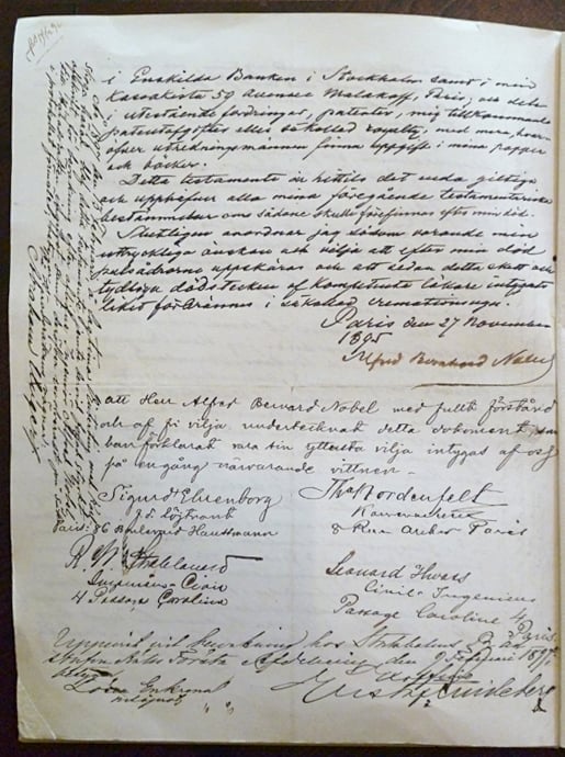 att Herr Alfred Bernhard Nobel med fullt förstånd och af fri vilja undertecknat detta dokument, som han förklarat vara sin yttersta vilja intygas af oss på en gång närvarande vittnen: