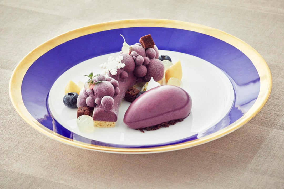 3 (of 3) Nobel Banquet dessert: Frosty bilberry bavaroise, bilberry ice cream with lemon thyme, lime jelly, lime curd and lime meringues.