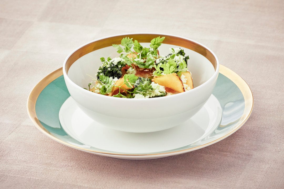 1 (of 3) Nobel Banquet entrée: Pressed and dried Jerusalem artichoke, served with kohlrabi flowers flavoured with ginger and lightly roasted cabbage broth.