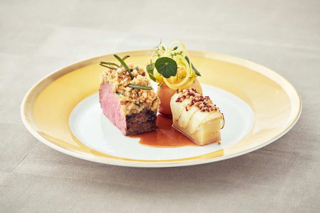 2 (of 3) Nobel Banquet main course: Crispy saddle of lamb, potato terrine with Svedjan crème, yellow beet, salt-baked celeriac, apple salad and rosemary-spiced lamb gravy.