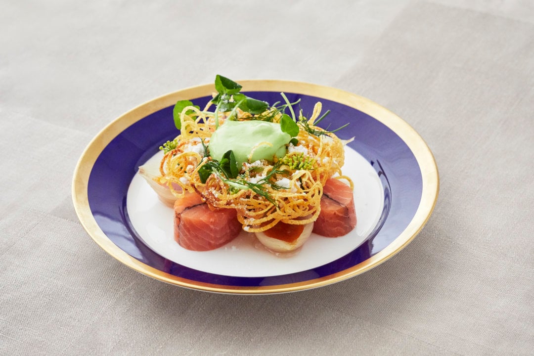 Omble chevalier au four, bouillon de langoustines sur petits oignons à l’aneth, œufs de truite fumés, spaghettis de pommes de terre et sauce crème de cresson