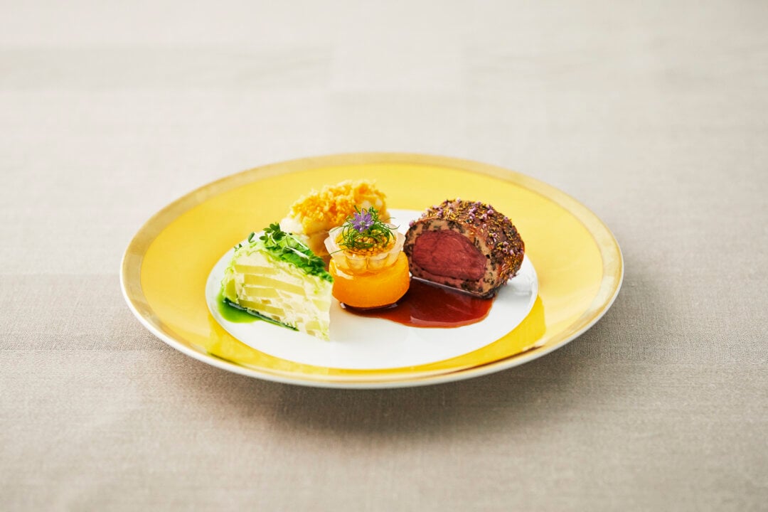 Swedish venison filled with morel and sage, golden beetroot with cold-pressed rapeseed oil and mustard seed, Jerusalem artichoke and thyme emulsion, accompanied by potato terrine and wild game gravy with star anise