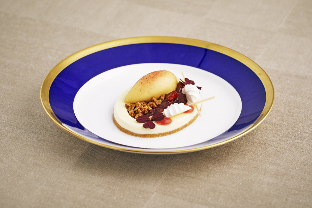 4 (of 4) The dessert: Baked cheesecake and plum compote, flavoured with star anise, plum creme, mirabelle meringues and oat crisp, accompanied by mirabelle sorbet flavoured with ginger