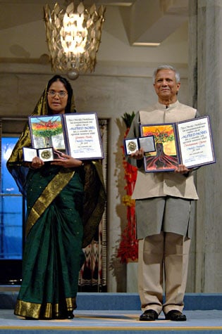 1 (of 15) Mosammat Taslima Begum (left), representing Grameen Bank, and Muhammad Yunus pose with their Nobel Peace Prize Medals and Diplomas.