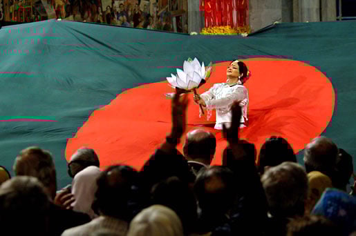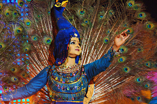 3 (of 15) A lady dancer holding a lotus flower appears in the middle of the flag of Bangladesh at the end of a dance routine during the Nobel Peace Prize Award Ceremony.