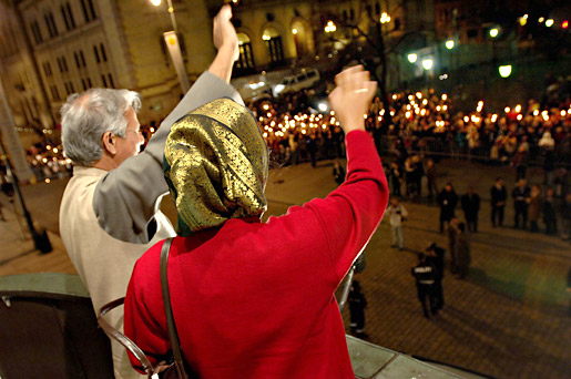 7 (of 15) Muhammad Yunus and Mosammat Taslima Begum (representing Grameen Bank), greet the crowd from the balcony outside the Grand Hotel in Oslo, Norway.
