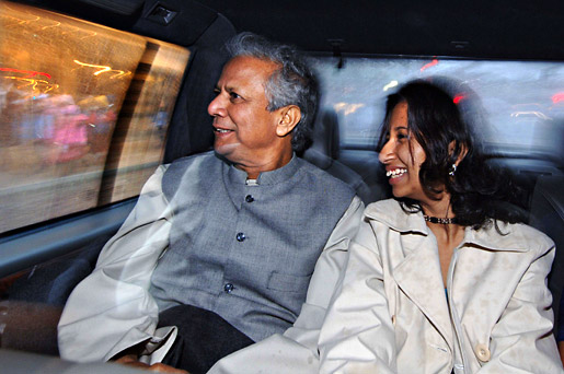 9 (of 15) Muhammad Yunus and his daughter, Deena, in the limousine driving through Oslo, Norway.