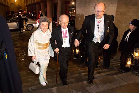 2 (of 28) Isamu Akasaki arrives at the Nobel Banquet at the Stockholm City Hall on 10 December 2014, together with his wife, Mrs Ryoko Akasaki.