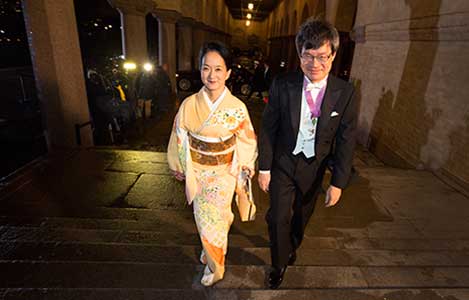 1 (of 28) Physics Laureate Hiroshi Amano arrives at the Nobel Banquet at the Stockholm City Hall together with his wife, Mrs Kasumi Amano.
