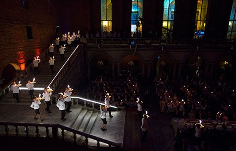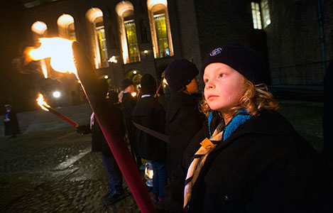 3 (of 28) Young scouters with torches welcome the Nobel Banquet guests to the Stockholm City Hall.
