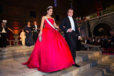 8 (of 28) Sweden's Crown Princess Victoria and Eric Betzig proceed into the Blue Hall of the Stockholm City Hall for the Nobel Banquet.
