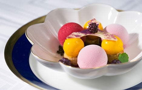 19 (of 28) A sparkling dessert arrives: mousse and sorbet of wild dewberries from Gotland, saffron panna cotta and brown butter sponge cake.