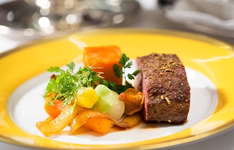 8 (of 16) The main course at the Nobel Banquet: spiced loin of red deer, carrot terrine, salt-baked golden beets, smoked pearl onions, potato purée and game jus.
