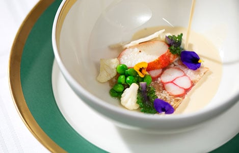 7 (of 16) The Nobel Banquet starter: cream of cauliflower soup, mosaic of red king crab, peas and lemon pickled cauliflower florets.