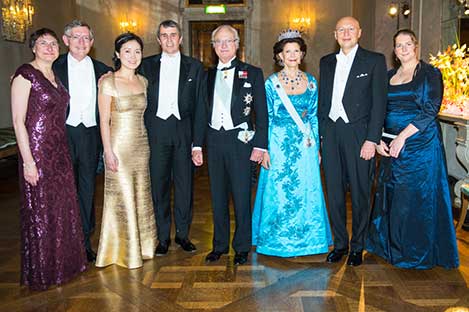 25 (of 28) The Swedish Royal Family receive the Laureates and their significant others in the Prince's Gallery after the Nobel Banquet. From left to right: Dr Sharon Stein Moerner, Nobel Laureate William E. Moerner, Dr Na Ji, Nobel Laureate Eric Betzig, His Majesty King Carl XVI Gustaf of Sweden, Her Majesty Queen Silvia, Nobel Laureate Stefan W. Hell and Professor Anna Kathrin Hell.