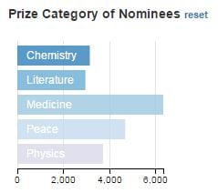 This graph displays all persons belonging to each Nobel Prize category. Click on a category to filter and display data about only these persons.