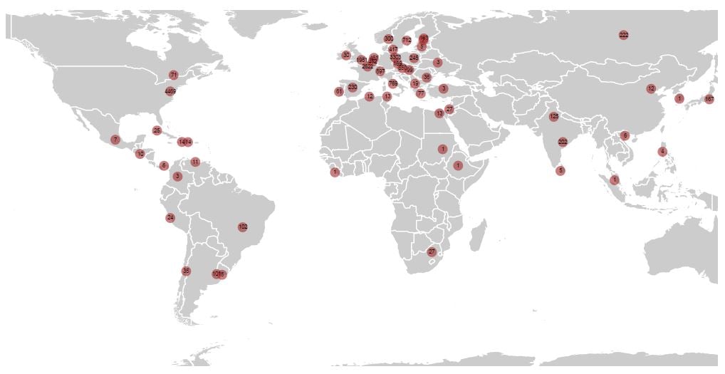 The map shows number of persons working in different countries at the time of the nomination. Click and drag to pan in the map. Use the scroll wheel to zoom in and out in the map.