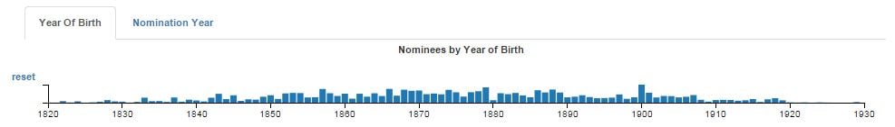 You can select between two timelines, one that displays the year of birth for the persons and one for the year of the nomination. The graph indicates the number of persons. Click and drag to select a range of years to filter and display about persons connected to these years only.