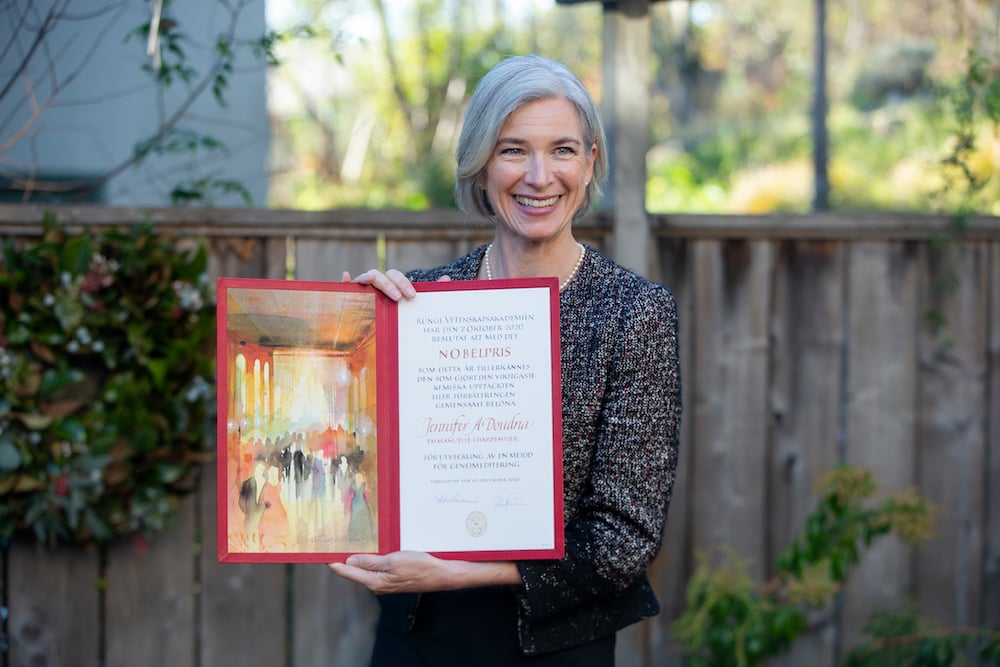 Chemistry laureate Jennifer A. Doudna with her Nobel Prize diploma in Berkeley, California, USA. A small ceremony was held where Doudna received the medal and diploma from Swedish honorary consul general Barbro Osher. Doudna also received a cookbook with recipes from the Nobel Prize banquet and a lot of chocolate medals. © Nobel Prize Outreach. Photo: Brittany Hosea-Small