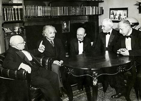 From left to right: Nobel Laureates Walther Nernst, Albert Einstein, Max Planck, Robert A. Millikan and Max von Laue at a dinner given by Professor von Laue in Berlin, 11 November 1931.