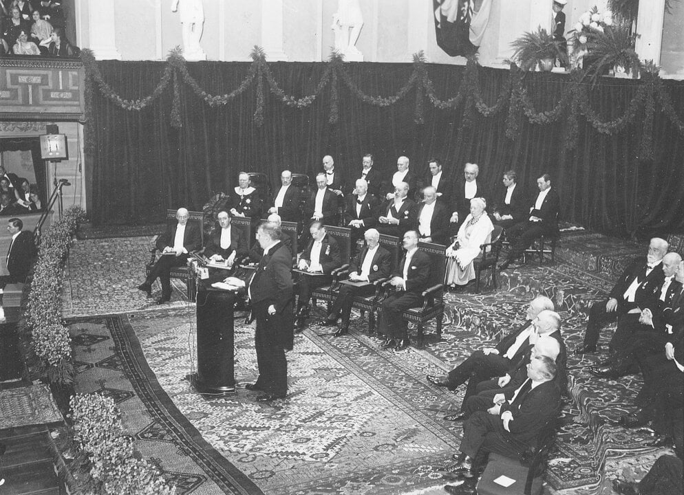 1 (of 1) Nobel Prize award ceremony in Stockholm, Sweden, 10 December 1929. From left: Owen Willans Richardson, physics laureate 1928; Louis de Broglie, physics laureate 1929; Arthur Harden and Hans von Euler-Chelpin, chemistry laureates 1929; Sir Frederick Hopkins, medicine laureate 1929 and Thomas Mann, literature laureate 1929.