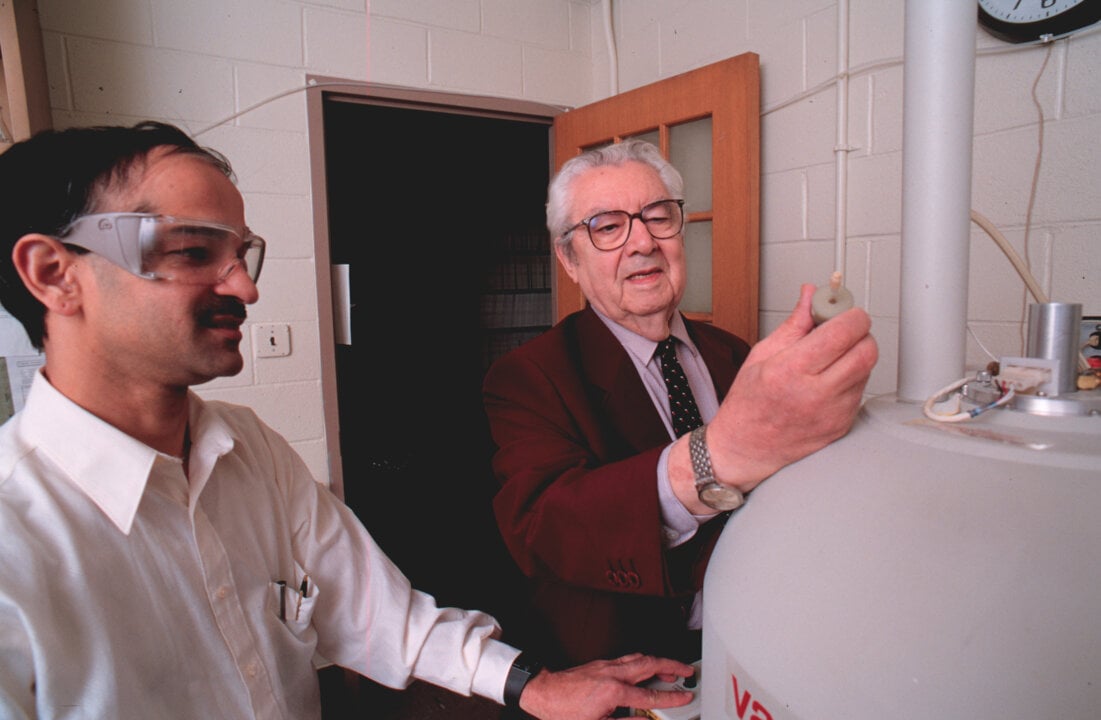 5 (of 5) In the mid-1990s, postdoctoral researcher P.V. Ramachandran and Professor Herbert C. Brown monitor a reaction using 11B NMR spectroscopy inside the NMR room of Wetherill Lab at Purdue University.