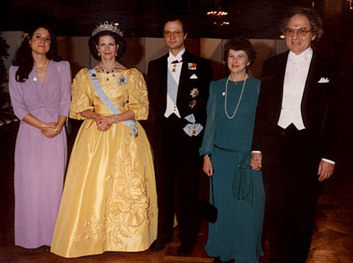 1 (of 1) HM Queen Silvia of Sweden, radiant in a yellow gown beside HM King Carl XVI Gustaf, poses with Herbert A. Hauptman and his family at the Nobel Banquet in the Stockholm City Hall, Sweden, on 10 December 1985.
