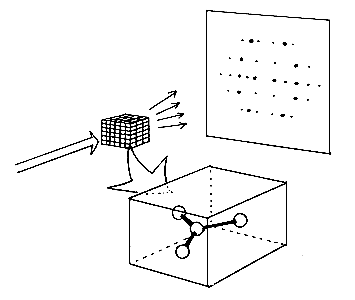 X-rays strike a crystal. The crystal contains a molecule, which is repeated throughout the whole crystal in all directions. The crystal deflects the x-rays in certain definite directions so that the radiation can be seen as spots of different intensity such as in a photographic film. To determine the structure the “phase” of each ray that is deflected must also be known. This determination can be carried out by using the “direct methods”.
