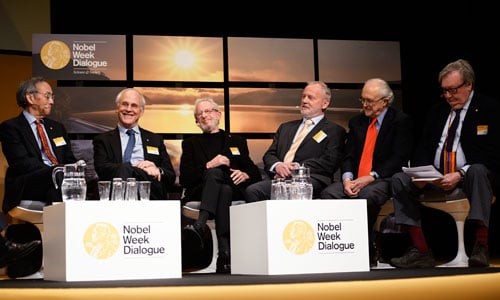 Six Nobel Laureates in a panel discussion at the 2013 Nobel Week Dialogue, Exploring The Future of Energy, on 9 December 2013. From left: 1997 Physics Laureate Steven Chu, 2004 Physics Laureate David Gross, 2000 Chemistry Laureate Alan Heeger, 1988 Chemistry Laureate Hartmut Michel, 1995 Chemistry Laureate Mario Molina and 1984 Physics Laureate Carlo Rubbia.