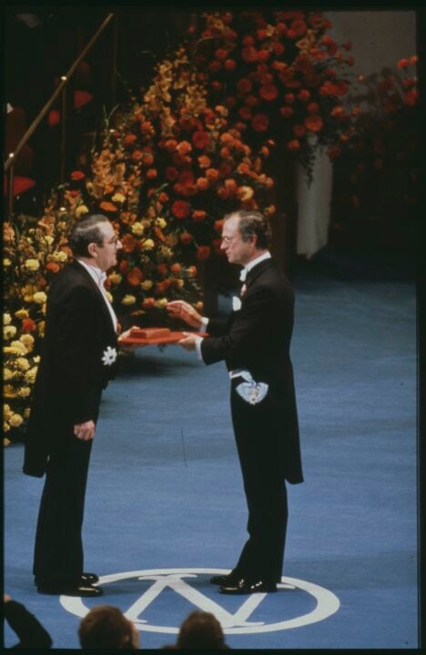 2 (of 5) All 1990 Nobel Prize laureates assembled on stage at the Nobel Prize award ceremony in Stockholm, Sweden on 10 December 1990: physics laureates Jerome I. Friedman, Henry W. Kendall and Richard E. Taylor, Chemistry laureate Elias James Corey, medicine laureates Joseph E. Murray and E. Donnall Thomas, literature laureate Octavio Paz and economic sciences laureates Harry M. Markowitz, Merton H. Miller and William F. Sharpe.
