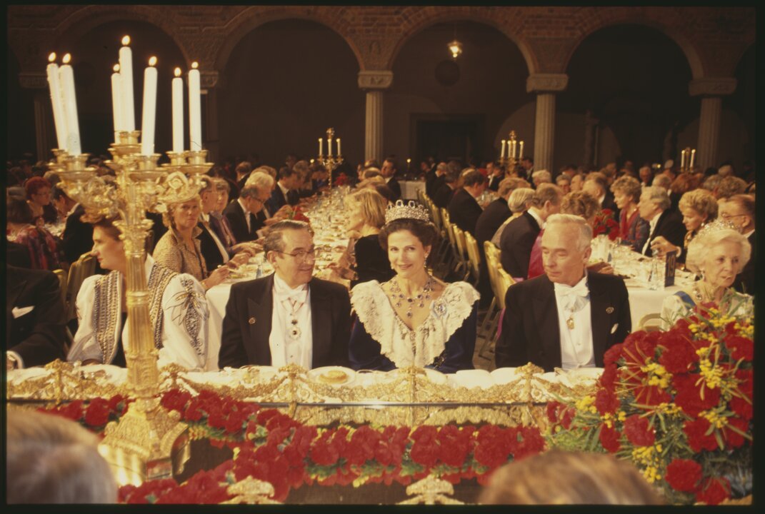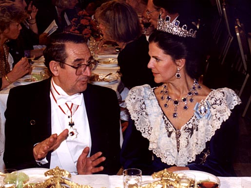 4 (of 5) Elias James Corey and HM Queen Silvia of Sweden at the Nobel Prize banquet in the Stockholm City Hall, Sweden, on 10 December 1990.