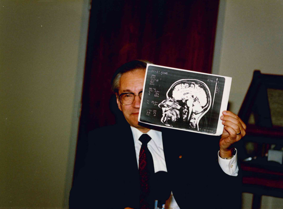 Richard Ernst showing an image obtained by Fourier NMR imaging at the Royal Swedish Academy of Sciences, 1991.