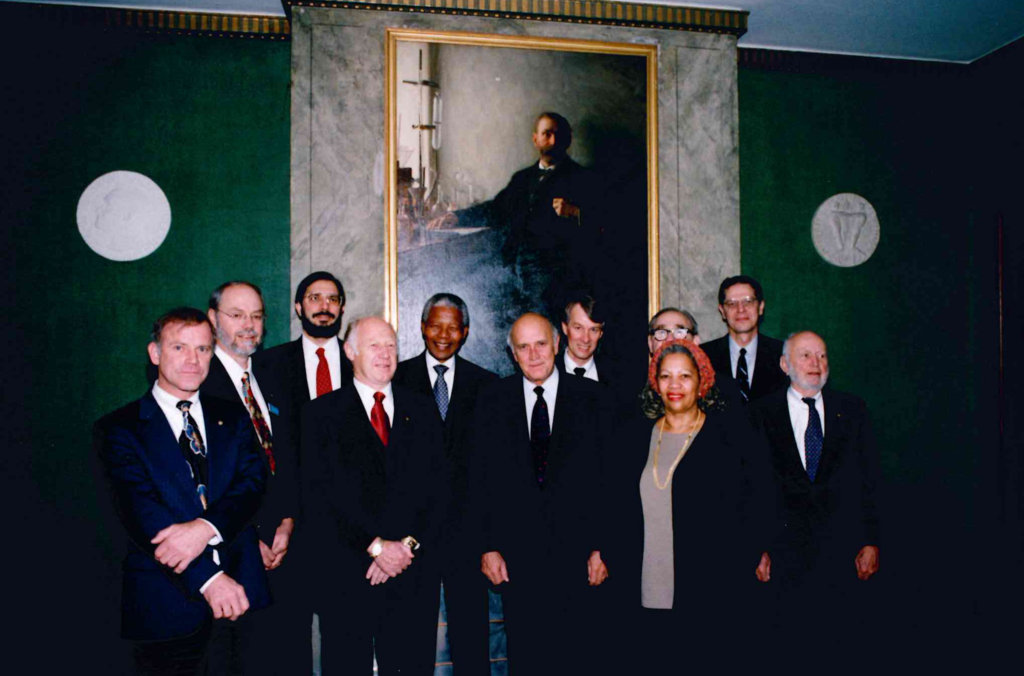 8 (of 8) Group photo of the 1993 Nobel Laureates, assembled at the Nobel Foundation, December 1993. From left: Chemistry Laureate Kary B. Mullis, Medicine Laureate Phillip A. Sharp, Physics Laureate Russell A. Hulse, Medicine Laureate Michael Smith, Peace Prize Laureates Nelson Mandela and Frederik Willem de Klerk, Medicine Laureate Richard J. Roberts, Laureate in Economic Sciences Robert W. Fogel, Literature Laureate Toni Morrison, Physics Laureate Joseph H. Taylor Jr. and Laureate in Economic Sciences Douglass C. North.