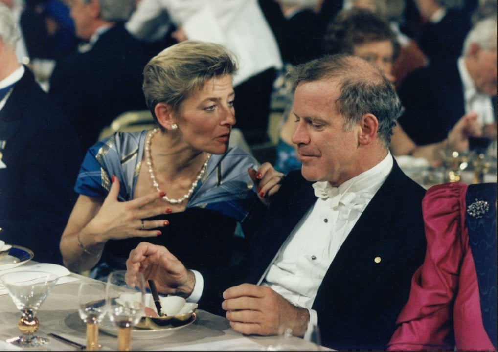 2 (of 8) All Nobel Laureates assembled at the Nobel Prize award ceremony in the Stockholm Concert Hall on 10 December 1993. From left: Physics Laureates Russell A. Hulse and Joseph H. Taylor Jr, Chemistry Laureates Kary B. Mullis and Michael Smith, Medicine Laureates Richard J. Roberts and Phillip A. Sharp, Literature Laureate Toni Morrison and Laureates in Economic Sciences Robert W. Fogel and Douglass C. North.