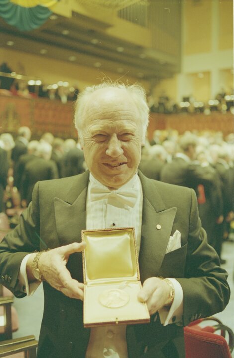 3 (of 8) Michael Smith showing his Nobel Prize medal after the Nobel Prize award ceremony in the Stockholm Concert Hall on 10 December 1993.