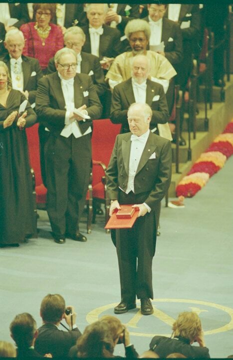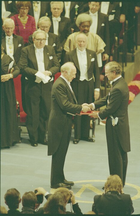 2 (of 8) Michael Smith after receiving his Nobel Prize from H.M. King Carl XVI Gustaf of Sweden at the Stockholm Concert Hall on 10 December 1993.