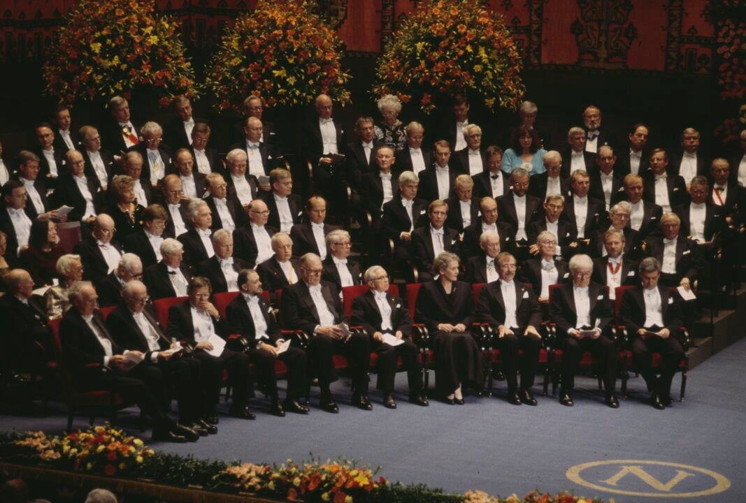 All 1995 Nobel Prize laureates on stage for the Nobel Prize award ceremony. From left: physics laureates Martin L. Perl and Frederick Reines; chemistry laureates Paul J. Crutzen, Mario J. Molina and F. Sherwood Rowland; medicine laureates Edward B. Lewis, Christiane Nüsslein-Volhard and Eric F. Wieschaus; literature laureate Seamus Heaney and laureate in economic sciences Robert E. Lucas Jr.