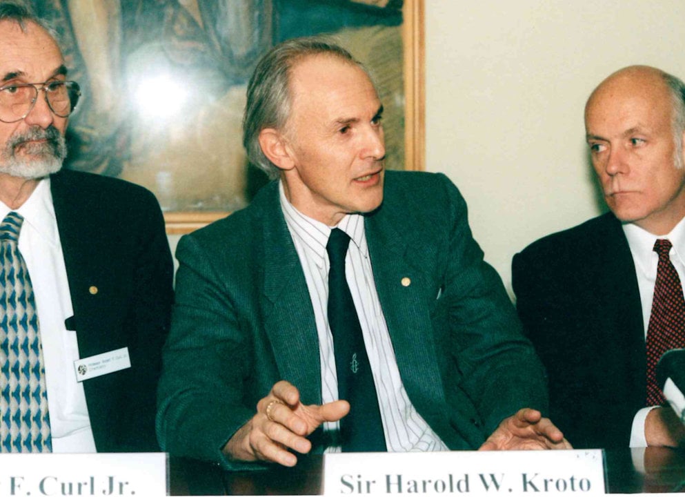 5 (of 16) Chemistry laureates Robert F. Curl Jr., Sir Harold Kroto and Richard E. Smalley at a press conference, December 1996.