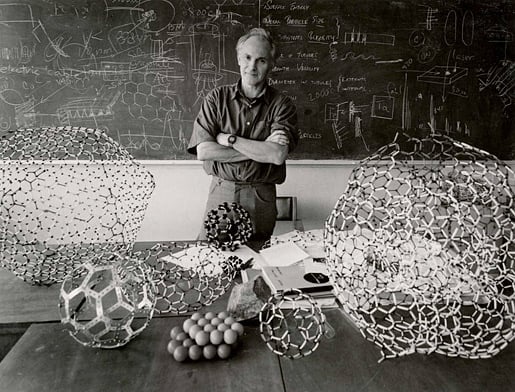 15 (of 16) Harold Kroto with a buckyball - a buckminsterfullerene - a molecule composed entirely of carbon. Photo taken in 1996.