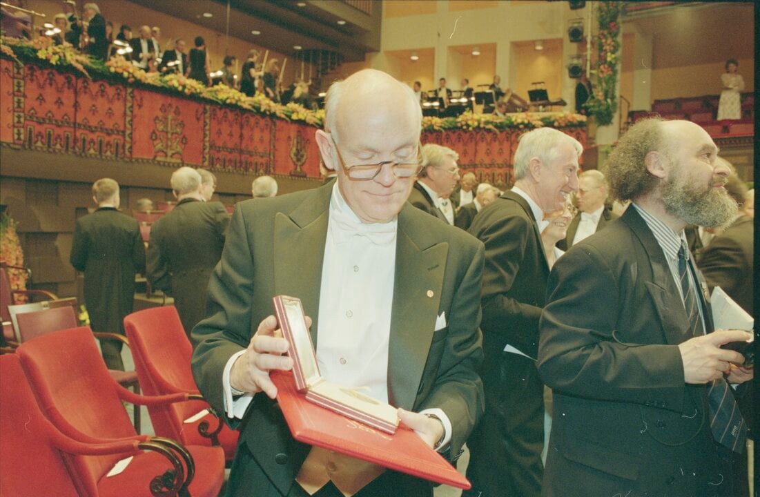 3 (of 13) All laureates assembled at the Nobel Prize award ceremony in the Stockholm Concert Hall on 10 December 1996. From left: physics laureates David M. Lee, Douglas D. Osheroff and Robert C. Richardson, chemistry laureates Robert F. Curl Jr., Sir Harold W. Kroto and Richard E. Smalley, medicine laureates Peter C. Doherty and Rolf M. Zinkernagel, literature laureate Wislawa Szymborska and economic sciences laureate James A. Mirrlees.