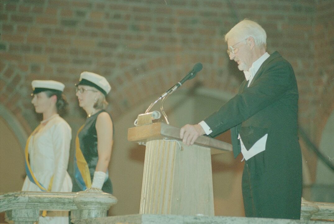 Jens C. Skou delivering his speech of thanks at the Nobel Prize banquet in the Stockholm City Hall, Sweden, on 10 December 1997.
