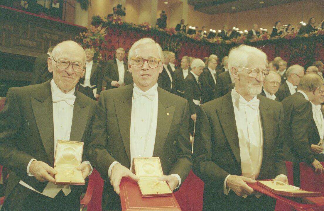 Chemistry laureates Paul D. Boyer, John E. Walker and Jens C. Skou showing their Nobel Prizes after the award ceremony at the Stockholm Concert Hall on 10 December 1997.