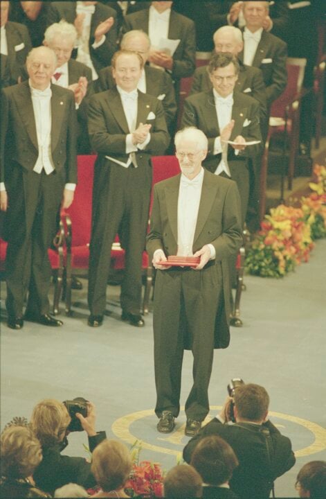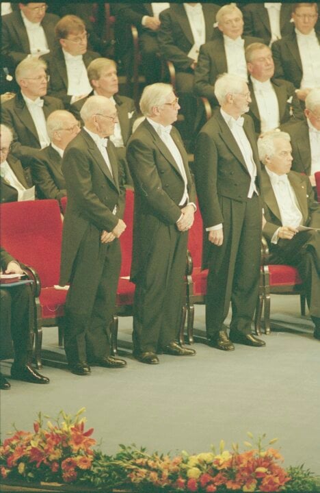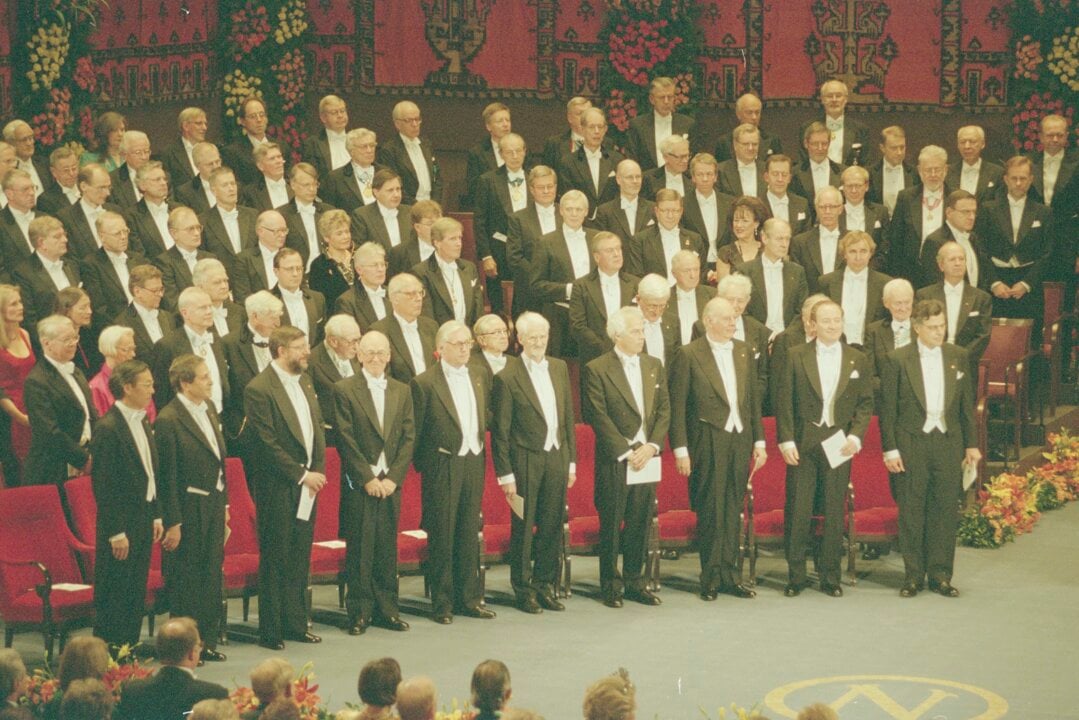 1997 Nobel Prize laureates on the Stockholm Concert Hall stage: From left: physics laureates Steven Chu, Claude Cohen-Tannoudji and William D. Phillips, chemistry laureates Paul D. Boyer, John E. Walker and Jens C. Skou, medicine laureate Stanley B. Prusiner, literature laureate Dario Fo and economic sciences laureates Robert C. Merton and Myron S. Scholes.