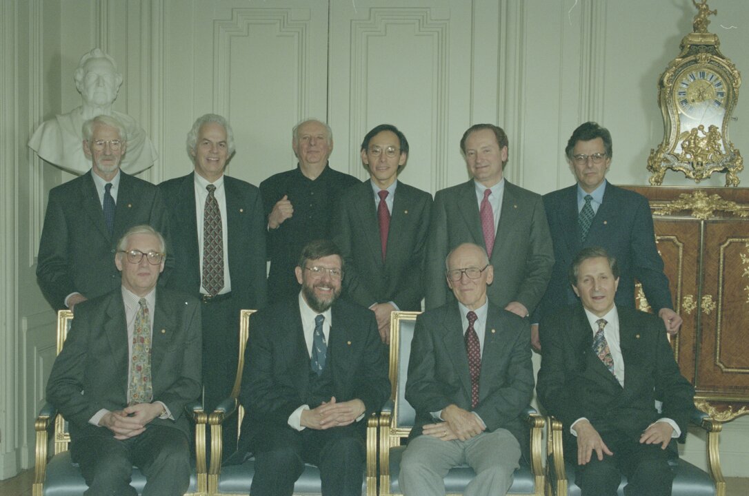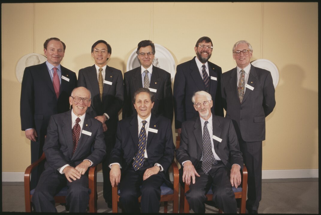 Eight of the 1997 Nobel Prize laureates assembled during Nobel Week, December 1997. Back row from left: Robert C. Merton, Steven Chu, Myron S. Scholes, William D. Phillips and and John E. Walker. Front row from left: Paul D. Boyer, Claude Cohen-Tannoudji and Jens C. Skou