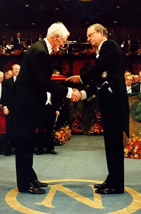 Jens C. Skou after receiving his Nobel Prize from H.M. King Carl XVI Gustaf of Sweden at the Stockholm Concert Hall on 10 December 1997.